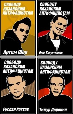 C’est à Kazan qu’ont eu lieu en juillet les Universiades, la compétition internationale du sport universitaire. Dès le 3 avril, les policiers du « Centre E » (Centre de lutte contre l’extrémisme ») ont perquisitionnés les maisons de quatre étudiants antifas anarchistes – Dmitri Ilichev, Oleg Kapustyanov, Ruslan Rostov et Artyom Sher. Tous les quatre ont été arrêtés. Ce n’est qu’au commissariat qu’ils ont été informés qu’ils étaient soupçonnés d’avoir pris part à une bagarre qui a eu lieu un mois avant. La nuit du 24 février, deux néo-nazis s’étaient fait rosser par quatre hommes masqués. Les nazis prétendent reconnaîtres les quatre antifas à la « forme de leurs yeux ». Les antifas sont accusés de hooliganisme commis avec motivation de haine idéologique. Selon les agents de l’E-Center, arrêtés sont membres de la «jeunesse informelle groupe Antifa». Tous onrt été maltraités au commissariat, et l’un d’eux battus pas les policiers. Oleg Kapustyanov, Ruslan Rostov et Artyom Sher sont restés en détentions provisoire. Dmitri Ilichev est dehors mais soumis à des restrictions de mouvement. En mai, un cinquième antifa, Timur Doronin, a été arrêté le 21 mai chez lui dans la banlieue de Kazan.