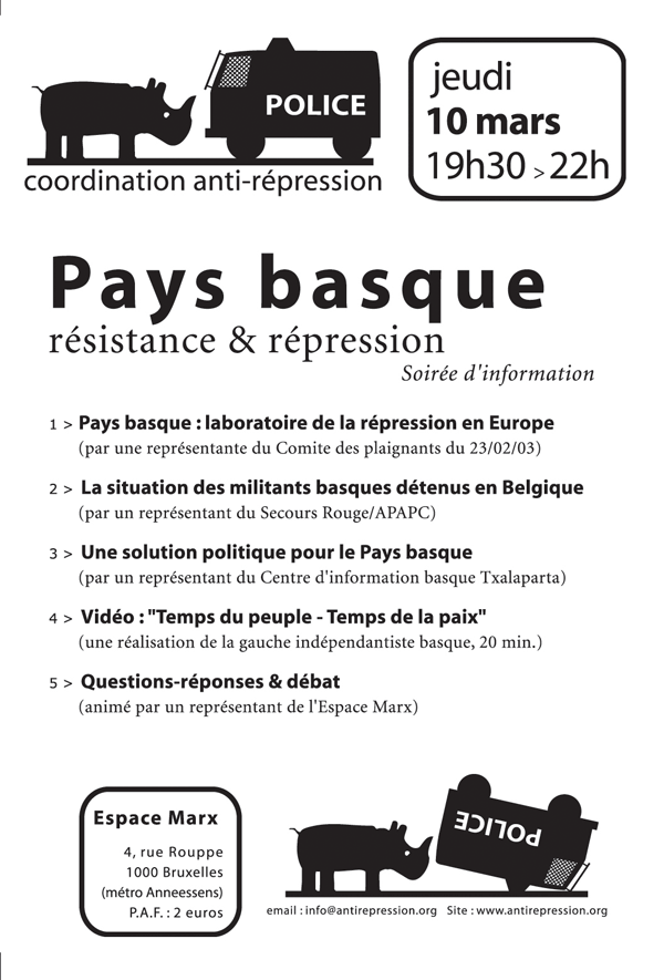 La Coordination Anti-répression (regroupant le Comité Anti-répression, issu du Comité des plaignants du 23 février 2003, le Secours Rouge/APAPC et l’Espace Marx), a organisé une soirée d’information en collaboration avec le Centre d’information basque Txalaparte sur le thème ‘Pays basque, résistance et répression‘. Animé par un représentant de l’Espace Marx, la soirée a commencé par un exposé de la représentante du Comité Anti-répression sur le thème: ‘Pays-Basque: laboratoire de la répression en Europe‘. La situation des militants basques détenus en Belgique a été ensuite exposée par un représentant de notre Secours Rouge/APAPC. Une vidéo réalisée par la gauche indépendantiste basque, intitulée ‘Temps du peuple – Temps de la paix’, a servi d’introduction au représentant du Centre d’information basque Txalaparta pour aborder la question des perspectives de solution politique pour le Pays-Basque. La quarantaine de personnes présentes ont participé au débat qui a suivi.