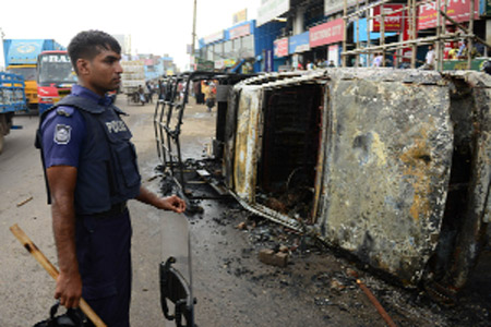 Des milliers d’ouvriers du textile se sont heurtés à la police et ont bloqué la route Ashulia-Baipail ce dimanche matin, un jour après que les propriétaires ont décidé de poursuivre le lock-out de plus de 300 usines de vêtements dans Ashulia, à la périphérie du capitale. Au moins 15 personnes incluant des policiers ont été blessées. Un grand nombre de membre des unités spéciales de la police ont été déployés pour protéger les usines. La plupart des usines d’Ashulia sont en lock-out depuis six jours, tandis que les ouvriers pour une hausse des salaires.