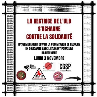 À la suite de l’occupation de l’Université Libre de Bruxelles en soutien au peuple palestinien au printemps 2024, un étudiant pro-palestinien est aujourd’hui pris pour cible dans une procédure disciplinaire. L’accusation porte sur des « coups et blessures avec motivation antisémite » alors que celui-ci s’opposait simplement à la provocation de militants pro-israéliens. A la […]