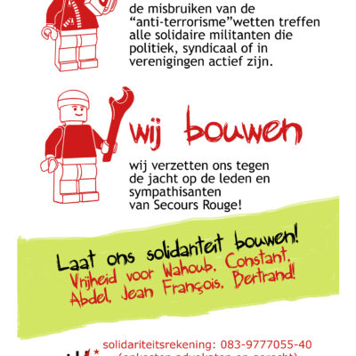 Il existe de nombreuses façons de manifester votre soutien aux membres et sympathisants du SR détenus: Vous pouvez contribuer financièrement: Soit en versant au compte solidarité: 083-9777055-40. Soit en prenant contact avec nous pour nous donner une enveloppe. Toute initiative est la bienvenue: on peut récolter des fonds facilement avec un repas, une projection, une […]