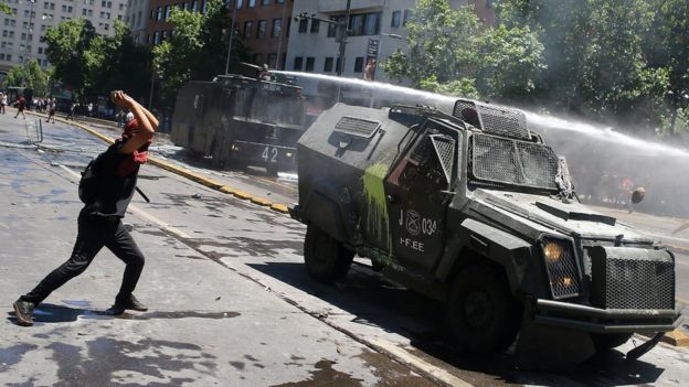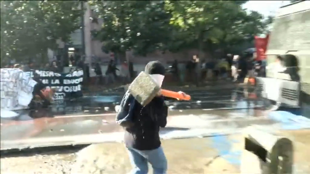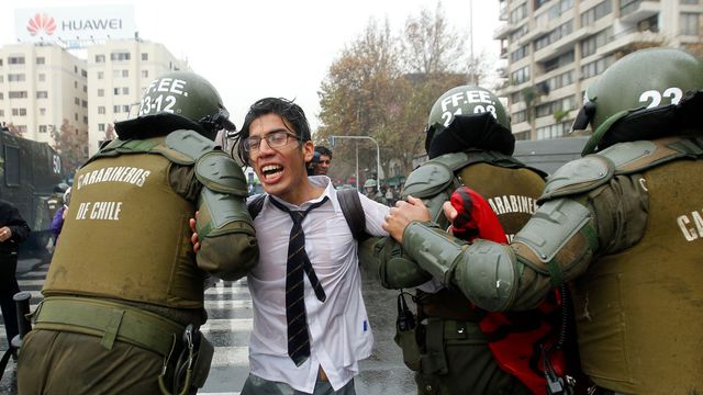 Des dizaines de milliers d’étudiants chiliens, peut-être 100.000, ont défilé dans la capitale et d’autres villes jeudi pour s’opposer à une réforme de l’éducation proposée qu’ils considèrent comme très insuffisante. Dans le centre de Santiago, des heurts ont éclaté, certains manifestants encagoulés jetant des pierres et des bâtons sur la police qui a répliqué avec des canons à eau et des gaz lacrymogènes. De nombreux commerces du centre de la capitale chilienne avaient baissé le rideau, et plusieurs stations de métro étaient fermées, tandis que la circulation a été coupée sur une partie de l’avenue Alameda, axe névralgique de la ville. 117 personnes ont été arrêtées.