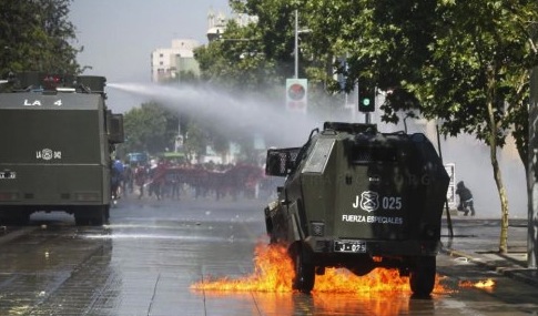 Une manifestation étudiante a été dispersée par des autopompes ce 9 octobre par la police de Santiago. Alors que des manifestants attaquaient une fourgonnette de police, le conducteur de la camionette a sorti son arme de service et tiré deux fois en l’air, touchant à la tête un homme de 21 ans dans son appartement au quatrième étage d’un immeuble avoisinant. La victime a été emmenée et opérée d’urgence, il souffre de dommages cérébraux irréversibles. Le policier a été arrété et devait comparaitre ce 10 octobre pour « blessures ayant provoqué des dommages cérébraux »
