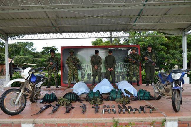 Des militaires de la huitième division d’infanterie, en coordination avec l’Armée de l’Air, la Marine et la police ont réussi aujourd’hui à tuer trois guérilleros et en capturant deux autres appartenant au Front « Saenz Domingo Lain » de l’ELN. L’affrontement, qui s’est déroulé dans la municipalité de Arauquita (département d’Arauca) a également coûté la vie à un sous-officier. L’armée a récupéré cinq armes, des motos et de grandes quantités de munitions,
