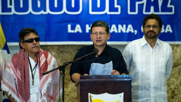 A partir du 15 décembre prochain, la guérilla des FARC observera un cessez-le-feu unilatéral pendant trente jours. Cette annonce a été faite via un communiqué rendu public hier à La Havane par Jesus Santrich, Ivan Marquez et Pablo Catatumbo: ‘De manière unilatérale, nous ordonnons à toutes nos unités (…) de cesser le feu et les hostilités pendant trente jours’. Cela fait maintenant plus d’un an qu’un processus de négociations est en cours entre les FARC et le gouvernement colombien. Au démarrage des discussions, la guérilla avait déjà observé un cessez-le-feu de deux mois, celui-là aussi unilatéral. Le gouvernement exclu, depuis le début, de relâcher la pression militaire avant qu’un accord ne soit conclu. L’armée poursuit donc régulièrement ses offensives.