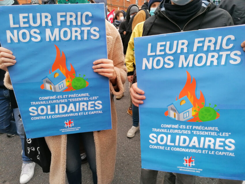 Dans la manifestation, de nombreux secteurs étaient présents. Un pôle rouge et noir a été formé ainsi qu’un cortège de salarié·e·s de l’aéronautique avec une banderole « De l’aéro aux hôpitaux, ensemble contre le macronavirus ». Deux initiatives auxquelles des membres du Secours Rouge Toulouse ont participé.
