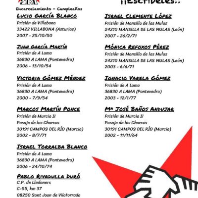Imad et Daniel sont deux antifascistes qui sont emprisonnés depuis plus de 600 jours dans le cadre de l’affaire des 6 de Saragosse (voir notre article). Ils sont maintenus en détention malgré des situations judiciaires identiques à celles d’autres personnes récemment graciées pour la même affaire. Par ailleurs, l’un d’entre eux, Imad, a enfin pu […]