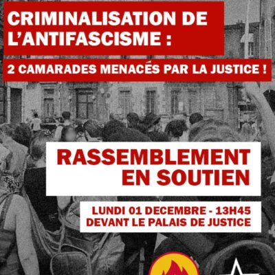 Le lundi 1ᵉʳ décembre à Clermont-Ferrand, deux militants doivent comparaître en justice pour leur présumée participation au saccage du local du Bastion Social, un groupuscule d’extrême droite. Sept ans après les faits, la justice a refusé la prescription dans ce dossier. Afin de les soutenir, un rassemblement est organisé le même jour dès 13H45 devant […]