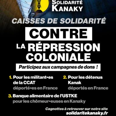 Le collectif Solidarité Kanaky a mis en place plusieurs caisses de solidarité pour soutenir les militant·es Kanak de la CCAT récemment libéré·es pour assurer des frais du quotidien (hébergement, recherche d’un travail, etc.) durant leur assignation à résidence, mais également en soutien à l’ensemble des détenus Kanak du Camp Est qui ont été déportés en […]