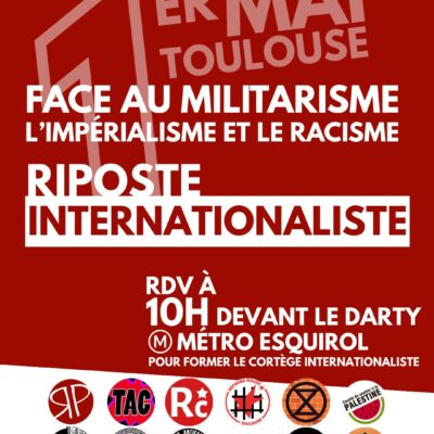 Plusieurs organisations révolutionnaires, antiracistes, anti-impérialistes et antifascistes appellent à former un cortège « Face au militarisme, l’impérialisme et le racisme : riposte internationaliste » lors de la manifestation du 1er mai à Toulouse. Le rendez-vous est donné à 10H devant Darty (métro Esquirol) Lire l’appel