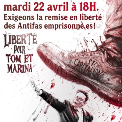 Mardi 22 avril à 18H, un rassemblement est organisé devant le Tribunal de Grande Instance de Toulouse en soutien à deux antifascistes emprisonné·es à Seysses depuis bientôt un an (voir notre article). Le lendemain, il et elle passent devant le juge au sujet d’une nouvelle demande de mise en liberté.