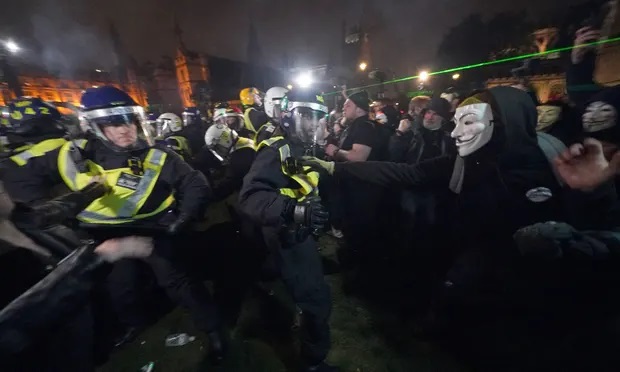 Comme chaque année depuis 2012, à l’appel du groupe de hackers Anonymous, de nombreux manifestants ont participé à la « Million Mask March » pour protester, entre autres, contre les inégalités, la corruption des élites et, plus récemment, les restrictions liées au Covid-19. Certains avaient des pancartes demandant la libération du co-fondateur de WikiLeaks, Julian Assange, incarcéré depuis 2019 en Angleterre, en attente d’un jugement sur une extradition aux Etats-Unis. La police s’est approchée de la foule et s’est heurtée à des manifestants, notamment lors du déclenchement de feux d’artifice, dont certains ont été envoyés dans leur direction. Les manifestants ont brûlé une effigie du Premier ministre britannique, Boris Johnson