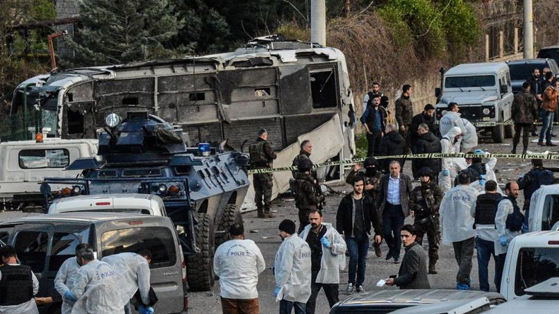 Le débris du camion des paramilitaires après l'explosion, à l'arrière plan, le cratère