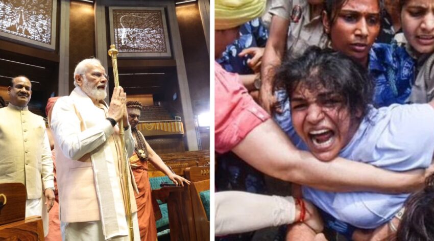 Dimanche 28 mai, à leur 36e jour de lutte, ils ont débordés les dispositifs policiers organisé devant le nouveau bâtiment du parlement que le premier ministre Modi inaugurait (photo de gauche). Des renforts de police ont été nécessaire pour les repousser. Il y a eu plusieurs arrestations, y compris plusieurs champions et championnes de lutte extrêmement populaires dans le pays (photo de droite).