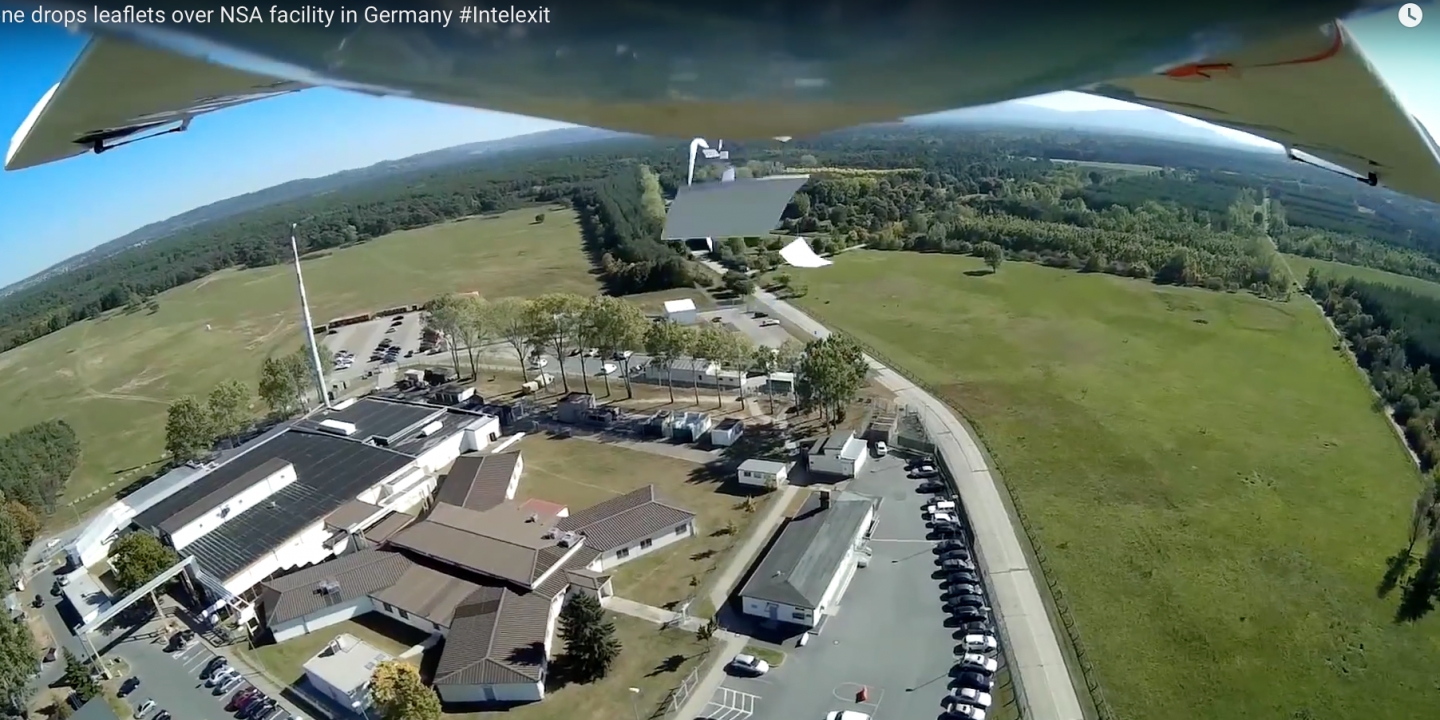 Un drone bombarde un complexe de la NSA avec des flyers.