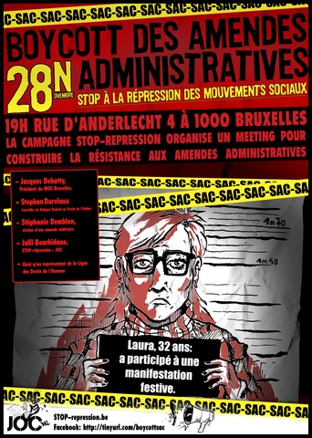 Un rassemblement « SAC, non merci » est organisé le 28 novembre à 13h30 sur la place Fernand Cocq devant la maison communale d’Ixelles. La campagne STOP-répression de la JOC organise un meeting après le rassemblement à 19h – rue d’Anderlecht 4, à 1000 Bruxelles. Le meeting réunira des intervenants ayant différents points de vues afin d’avoir une discussion large sur la façon de construire une résistance aux amendes administratives.