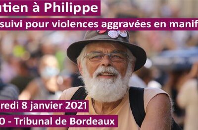 Philippe, militant bordelais de toutes les luttes sociales, est accusé de « violences aggravées » en manifestation suite à sa participation à une mobilisation des Gilets Jaunes le 25 janvier 2020. Ses soutiens appellent à un rassemblement vendredi 8 janvier à 13H30 devant le Tribunal de Grande Instance de Bordeaux. L’événement Facebook