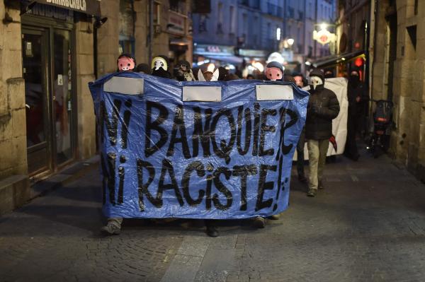 A Nantes, derrière une banderole de tête proclamant « ni banquier, ni raciste » et aux cris de « Nantes debout soulève toi, ni Le Pen, ni Macron » une manifestation a démarré vers 21H15 dans le centre-ville, avant d’être dispersé par les forces de l’ordre moins d’une heure plus tard. Des manifestants ont lancé des cocktails Molotov contre la FNAC et ont cassé des vitrines d’agences bancaires. Les forces de l’ordre, présentes en nombre, ont tiré des grenades lacrymogène et de grenades de désencerclement, ainsi qu’au flashball.