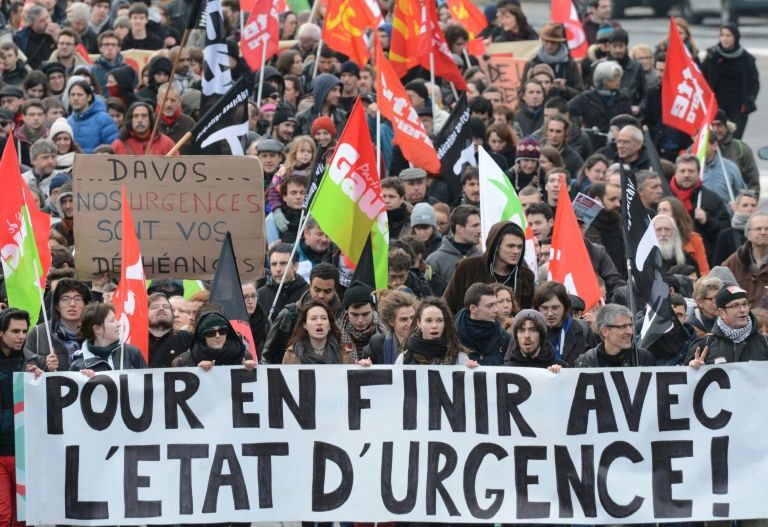 Les manifestants, regroupés derrière une banderole proclamant «Pour en finir avec l’état d’urgence», ont scandé «état d’urgence, état policier, on nous empêchera pas de manifester», ou encore «Assignés à résistance contre l’état d’urgence», tandis qu’un hélicoptère les survolait. Sur une pancarte, on pouvait lire «La liberté se meurt en toute sécurité» ou bien «Davos: nos urgences sont vos déchéances», en référence au Forum économique mondial qui se déroule actuellement en Suisse. Certains manifestants ont collé sur les murs des affichettes représentant une caméra de surveillance et affirmant «l’Etat nous surveille, crevons lui les yeux». D’autres, au visage caché derrière un foulard, ont peint sur les murs d’autres appels à manifester, à l’aide de bombes de peinture.