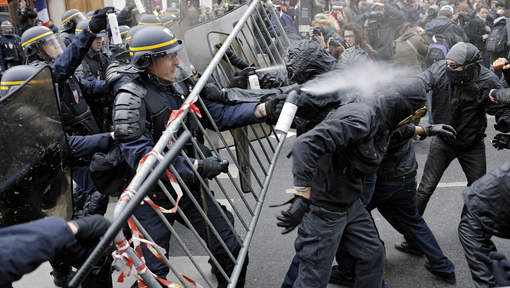 En fin de matinée, une chaîne humaine s’est mise en place entre République et Nation, réunissant des milliers de personnes. A l’origine, une manifestation devait se tenir sur ce tracé, mais elle a été annulée à la suite des attentats du 13 novembre. Une partie de la foule s’est dispersée vers 12 h 30, tandis que des actions continuaient place de la République. Peu avant 14 heures un cortège a tenté d’emprunter l’avenue de la République, derrière une banderole de plusieurs organisations anarchistes. Après un face-à-face tendu d’une vingtaine de minutes avec les CRS, les manifestants ont entrepris de faire le tour de la place, se heurtant à chaque artère à une haie de policiers. Parmi les slogans, «Police partout, justice nulle part», «Etat d’urgence, on s’en fout, on ne veut pas d’Etat du tout», «Police nationale, police du Capital» ou encore «Flics, porcs, assassins». Aux lancers de projectiles divers, les CRS ont répliqué par des charges et des tirs de grenades lacrymogènes, qui ont noyé la place de la République pendant près d’une heure.
