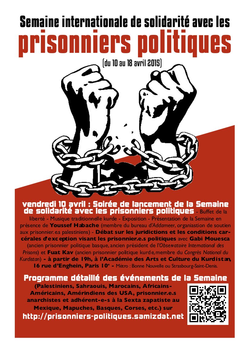 Jeudi 16 avril 2015 19h : Soirée de solidarité avec les prisonnier.e.s politiques corses organisée par l’Associu Sulidarità. Projection du film Génération FLNC sur l’histoire du groupe armé FLNC. Discussion sur la situation politique en Corse. Bar et buffet solidaires. Chants de la résistance corse avec le groupe Scontru. Au CICP.