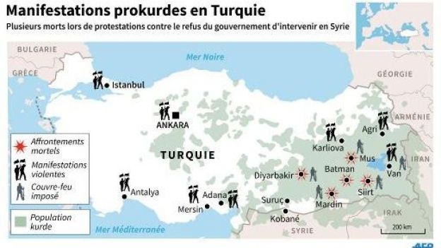 Les autorités turques ont imposé mercredi un couvre-feu militaire dans six provinces, au lendemain de violentes émeutes kurdes déclenchées par le refus du gouvernement d’Ankara d’intervenir en faveur de Kobané, qui ont fait au moins 21 morts. Malgré ces mesures imposées pour la première fois depuis 1992, de nouveaux affrontements ont eu lieu à Diyarbakir, Mardin, Van ou Batman, ainsi que dans la capitale Ankara, où les forces de l’ordre ont utilisé des gaz lacrymogènes et des canons à eau pour disperser des manifestants.