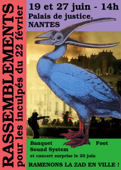 Suite à la manifestation de Nantes du 22 février, une première vague d’arrestations a eu lieu fin mars : 9 personnes sont interpellées à leur domicile sur la base de photos. Suite à ce coup de filet, une personne est condamnée à un an de prison ferme à Carquefou. Une autre des personnes sera jugée le 19 juin. Depuis, une nouvelle personne a été arrêtée à Paris. Suite à un contrôle de police, elle est interpellée et transférée à Nantes. Elle ne déclare rien lors de sa garde-à-vue et refuse la comparution immédiate. Conséquence : un séjour à la prison de Carquefou jusqu’à son procès, le 27 juin, à Nantes. Les chefs d’inculpation retenus sont dégradations et violence contre agent.