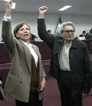 Emprisonnés depuis dix-huit ans, ils protestent contre les autorités péruviennes qui ne leur donne pas les documents nécessaires pour réaliser les démarches administratives à leur mariage. Le mariage leur donnerait un droit de visite que les autorités veulent éviter. Il y a déjà plusieurs mois que l’avocat a annoncé la volonté d’Abimael Guzman, 75 ans et d’Elena Iparraguirre, 62 ans de se marier. Ensemble, ils ont mené la guerre populaire. Ils étaient aussi ensemble le 12 septembre 1992, lorsque la police perquisitionna la base où ils logeait le président Gonzalo. Jugés pour « terrorisme aggravé contre l’Etat » et « d’homicides qualifiés » (la photo les montre à leur procès, en novembre 2004), ils purgent aujourd’hui, chacun de leur côté, une peine de prison à perpétuité.