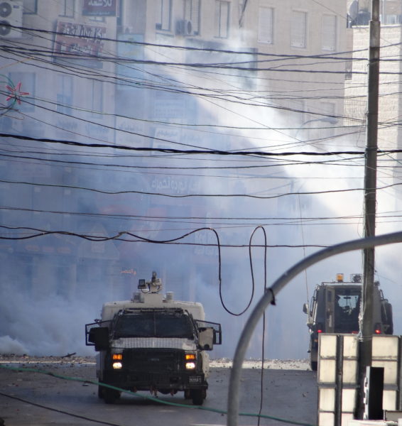 Véhiule anti-émeute israélien rue Faisal al-Maliki, à Bab al-Zawiyah