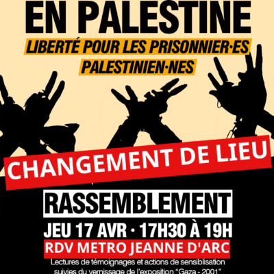 A l’occasion de la Journée du prisonnier palestinien, le Comité de soutien à la Palestine 31 organise un rassemblement ce jeudi 17 avril à 18h30 au métro Jeanne d’Arc à Toulouse. Cette initiative exige la fin du génocide en Palestine et la libération des plus de 9900 prisonniers palestiniens détenus par l’occupation israélienne.