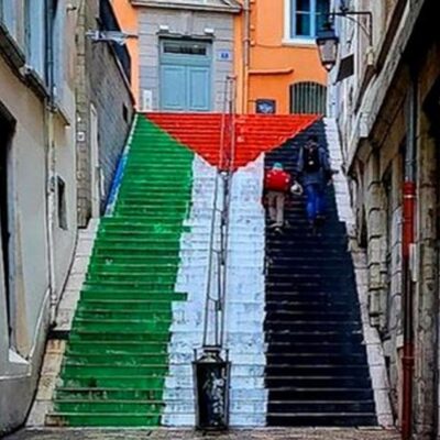 Dans la nuit du dimanche 11 au lundi 12 février, les marches de l’escalier de la rue Sainte Marie des Terreaux, à Lyon, ont été repeintes aux couleurs de la Palestine, pour visibiliser l’horreur du génocide pratiqué par l’armée d’occupation israélienne.