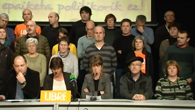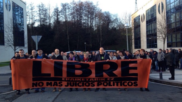 Avant l’audience, les 35 militants se sont présentés à la presse, en rang serré derrière une banderole où était écrit: « Plus de procès politiques ». Ce procès est en préparation depuis huit ans et doit s’achever en mars 2016. Jugés pour « participation à une organisation terroriste », les 35 militants doivent répondre d’activités politiques (signatures d’articles, conférences de presse, meetings…) menées après l’interdiction de l’organisation. Ils encourent jusqu’à dix ans de prison et l’interdiction d’exercer des mandats publics pendant au moins dix ans. En janvier, les audiences avaient été repoussées après l’interpellation d’avocats de la défense, également accusé de complicité avec ETA.