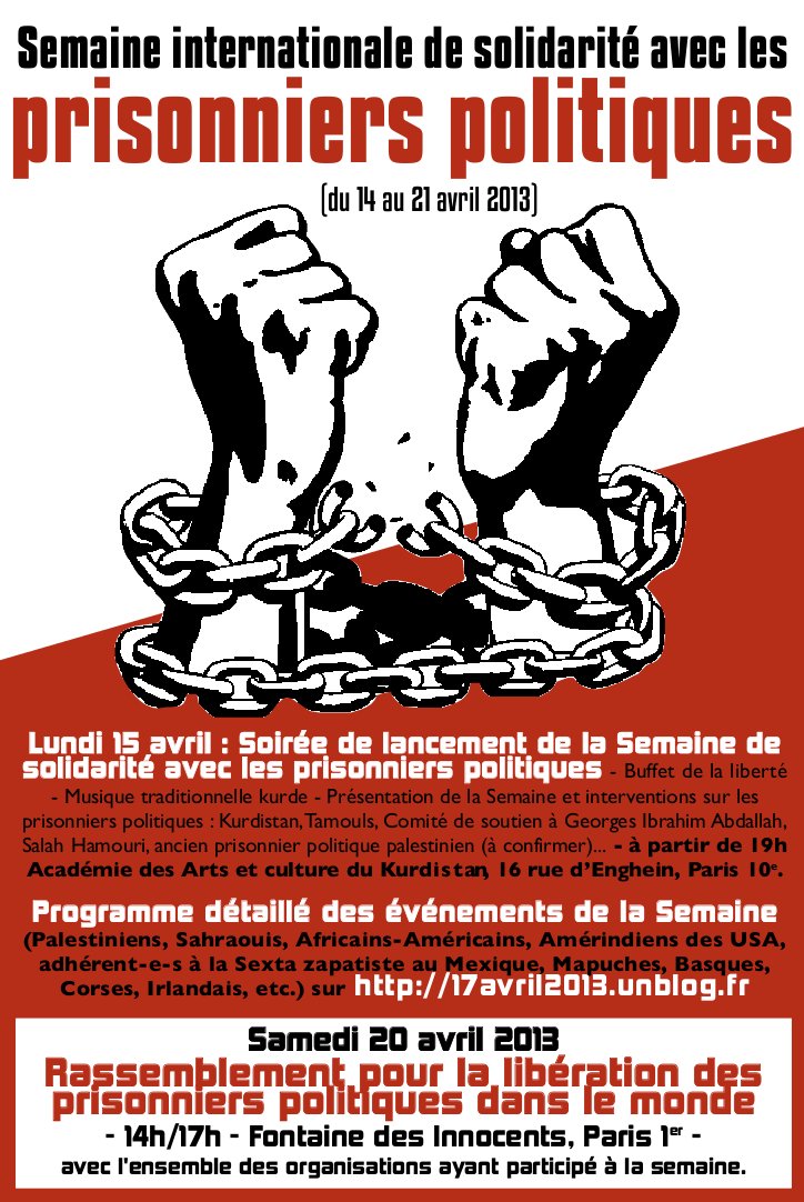 Du 14 au 21 avril 2013 se déroulera en France la semaine internationale de solidarité avec les prisonniers politiques. En 2004, réunies à l’occasion de la première conférence internationale sur les prisonniers politiques à Donostia (Pays basque), plusieurs organisations ont adopté une déclaration faisant du 17 avril la Journée internationale des prisonniers politiques. Cette date, choisie en référence à la Journée du prisonnier palestinien instituée en 1975.