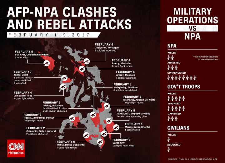 Le 17 février, deux soldats et trois guérilleros maoïstes ont été tués tandis que 15 autres soldats ont été blessés lors d’une embuscade de la NPA. Les guérilleros ont fait exploser un IED au passage d’un convoi de troupes qui participaient à une opération de recherche d’un groupe de guérilleros qui avaient précédemment incendié un plantation de Del Monte, à Barangay Tawantawan, dans le district de Calinan. Les deux soldats ont été tués et 15 autres ont été blessés dans l’explosion, tandis que deux guérilleros sont morts dans la fusillade qui a suivi. Quelques heures plus tôt, dans le district de Paquibato, un autre affrontement s’était soldé par la mort d’un guérillero. Et le même jour, des guérilleros ont attaqué un convoi militaire à Marawi, tuant un officier des renseignements militaires et son ordonnance.