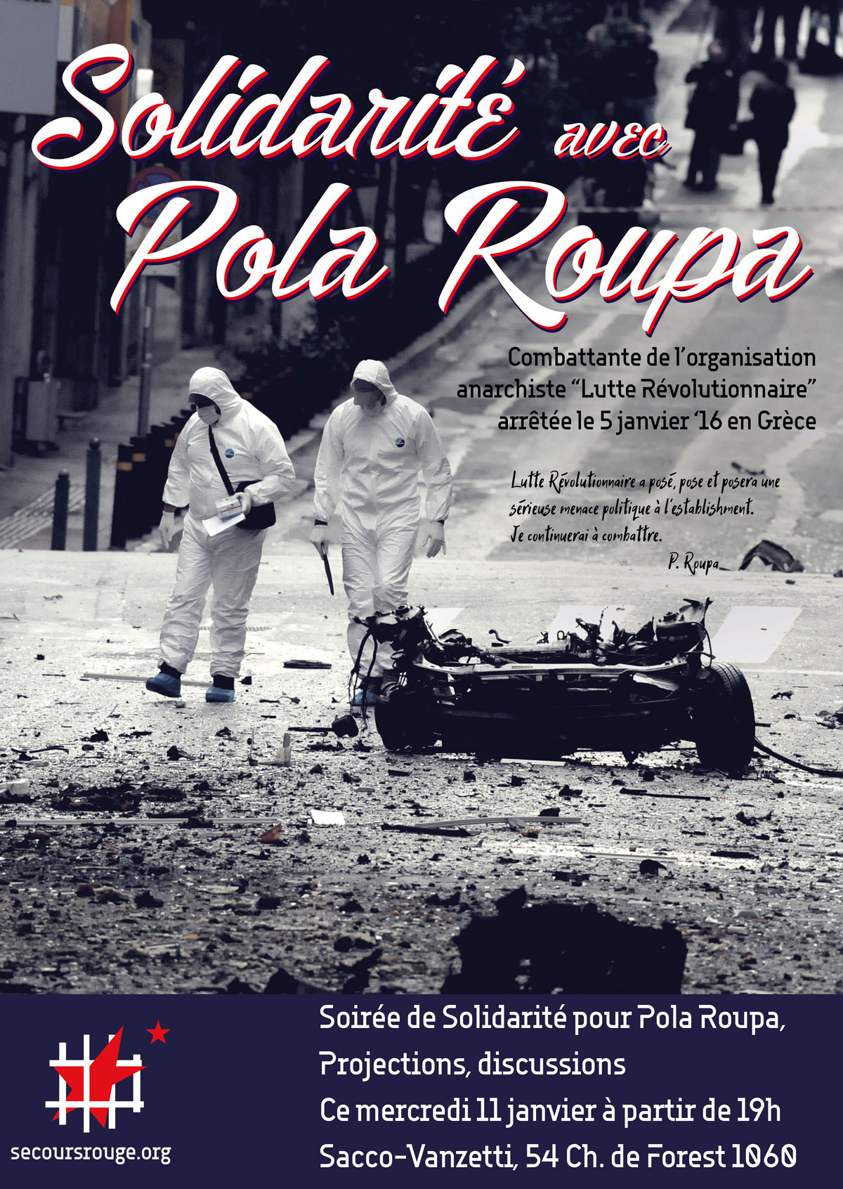 Ce 11 janvier sera pour nous l’occasion de diffuser l’interview de Pola et Nikos « Il n’y a d’autre fin que la révolution » (tournée par le Secours Rouge à Athènes en 2012), de promouvoir de nouveaux outils pour diffuser les écrits des révolutionnaires emprisonnés ainsi que de discuter des perspectives de solidarité avec Pola Roupa, Nikos Maziotis et les nombreux prisonniers révolutionnaires en Grèce.