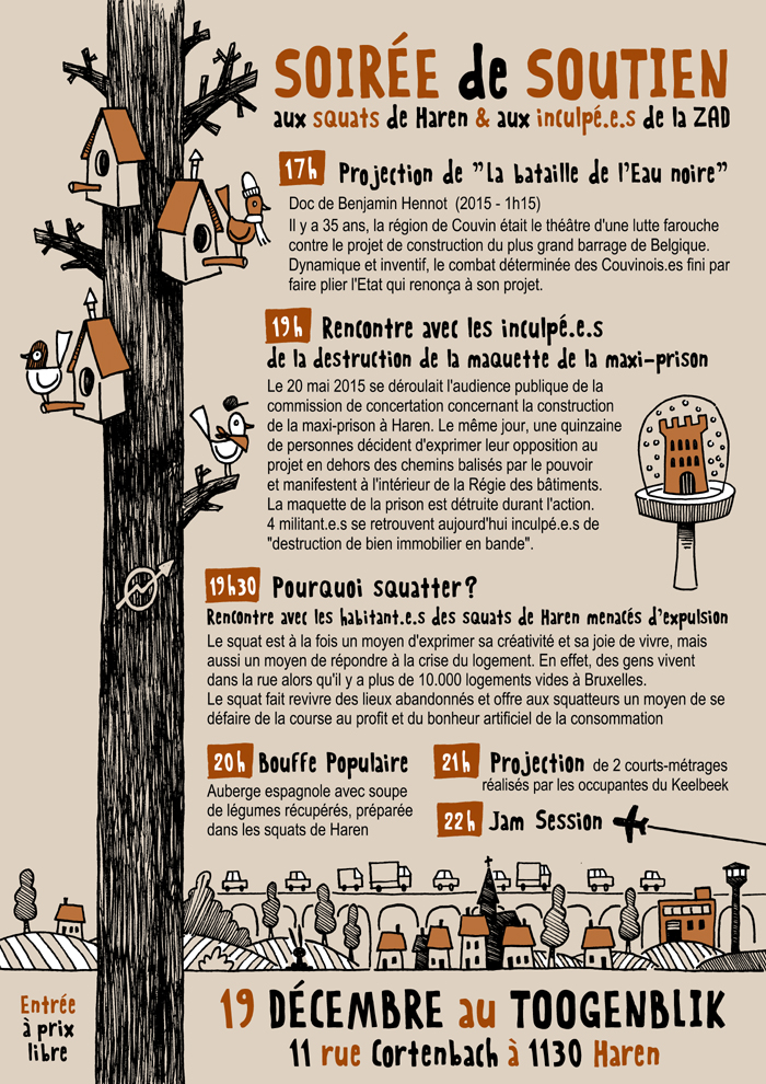 EDIT: Erreur de notre part, ce sont 40.000€ et non 50.000 qui sont réclamés par la régie des bâtiments. Les 150 heures de TIG réclamées par la procureure ont été refusées par les inculpé(e)s, la procureure réclamant que ces heures soit prestées en faveur d’une institution de l’Etat ayant un rôle dans l’appareil coercitif, comme la régie des bâtiments a-t-elle précisée.