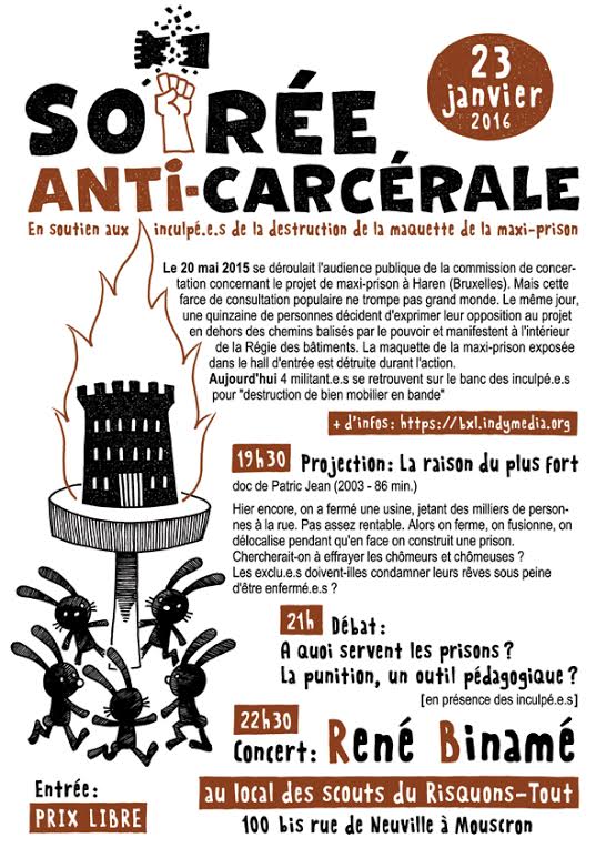 Audience ce matin à la 47e chambre correctionnelle du palais de justice de Bruxelles. Quatre inculpé(e)s étaient présent(e)s, qui devaient répondre de « bande organisée » et « destruction et dégradations de biens immobiliers ». L’audience aurait dû avoir lieu le 10 décembre dernier mais avait été reportée à ce jour. A l’interrogatoire de la juge, les inculpé(e)s ont reconnus avoir participé à la manifestation surprise qui s’était tenue ce 20 mai dans le hall de la Régie des bâtiments (celle-ci avait commencé les travaux de la prison malgré l’interdiction), mais niaient avoir un rapport avec la destruction.