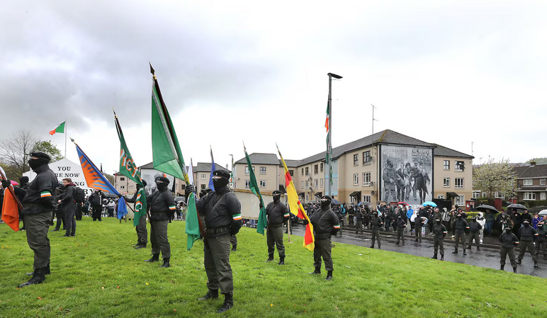 Thomas Joseph Moore, de Farren Park, un agent de sécurité de 35 ans est accusé d’avoir dirigé les militants en uniformes lors de la commémoration effectuée par les républicain dissident, proches de la Nouvelle IRA, à Derry le lundi de Pâques (photo). Les chefs d’accusation sont: avoir organisé un défilé en soutien à une organisation interdite, l’IRA, le 21 avril, avoir aidé et encouragé le port de tenues militaires en soutien à une organisation interdite et avoir aidé et encouragé la violation des dispositions de la Commission des défilés. Il devait être remis en liberté sous caution par les magistrats mais suite à un appel du parquet, sa libération a été suspendue, le temps que la police complète l’enquête.