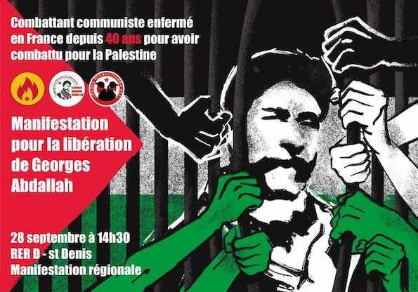 Une manifestation régionale aura lieu leu 28 septembre, au départ à 14h30 de la gare du RER D de Saint-Denis, organisée par la LJR, les JR et la Campagne Unitaire pour la libération de Georges Abdallah afin d’exiger la libération immédiate de Georges Abdallah et appuyer sa 10e demande de libération conditionnelle examinée le 7 octobre prochain.
