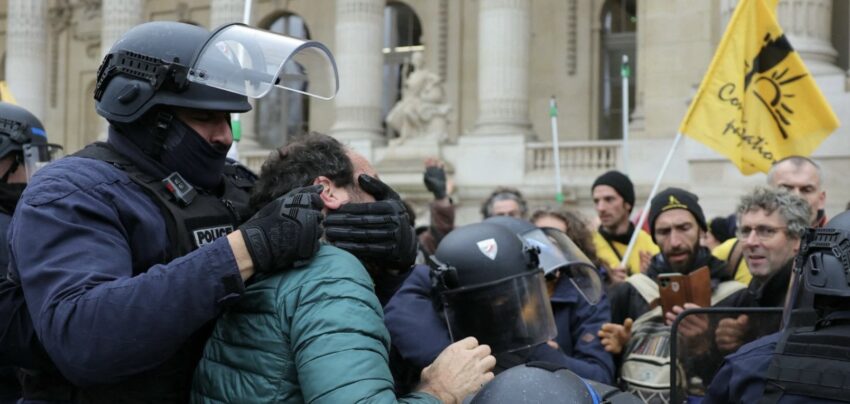 Jeudi 5 décembre , « Sauvez les paysan.n.es, mangez un trader », proclamait une grande banderole jaune aux couleurs du syndicat de la confédération paysanne, déployée sur le parvis du Grand Palais à Paris. 200 agriculteurs ont participé à une manifestation à l’appel du syndicat. La Confédération paysanne a rassemblé les agriculteurs pour mener une action coup de poing et dénoncer les conditions de travail des agriculteurs. « On vous nourrit, respectez-nous », ont scandé les personnes présentes, ou encore « Traders, tremblez, les paysans reprennent leur blé » dénonçant la dérégulation des marchés. Cette manifestation intervient alors que s’ouvre en Uruguay le sommet du Mercosur, un accord de libre-échange. Une partie d’entre eux ont tenté d’entrer dans le bâtiment où se tient la 64e Bourse de commerce européenne, concernant les grands acteurs des céréales. Les agriculteurs ont subi une forte répression, des dizaines de policiers et de gendarmes, mais aussi la BRAV, sont intervenus avec brutalité. Cinq paysan-nes ont été arrêté-es et placé-es en garde à vue pour «violences et tentatives d’intrusion».