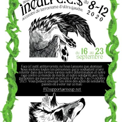 Les 7 camarades arrêté·es le 8 décembre 2020 passeront en procès du 3 au 27 octobre 2023. Iels seront jugé·es pour « délit d’association de malfaiteurs terroristes » (art. 450-1) à Paris.