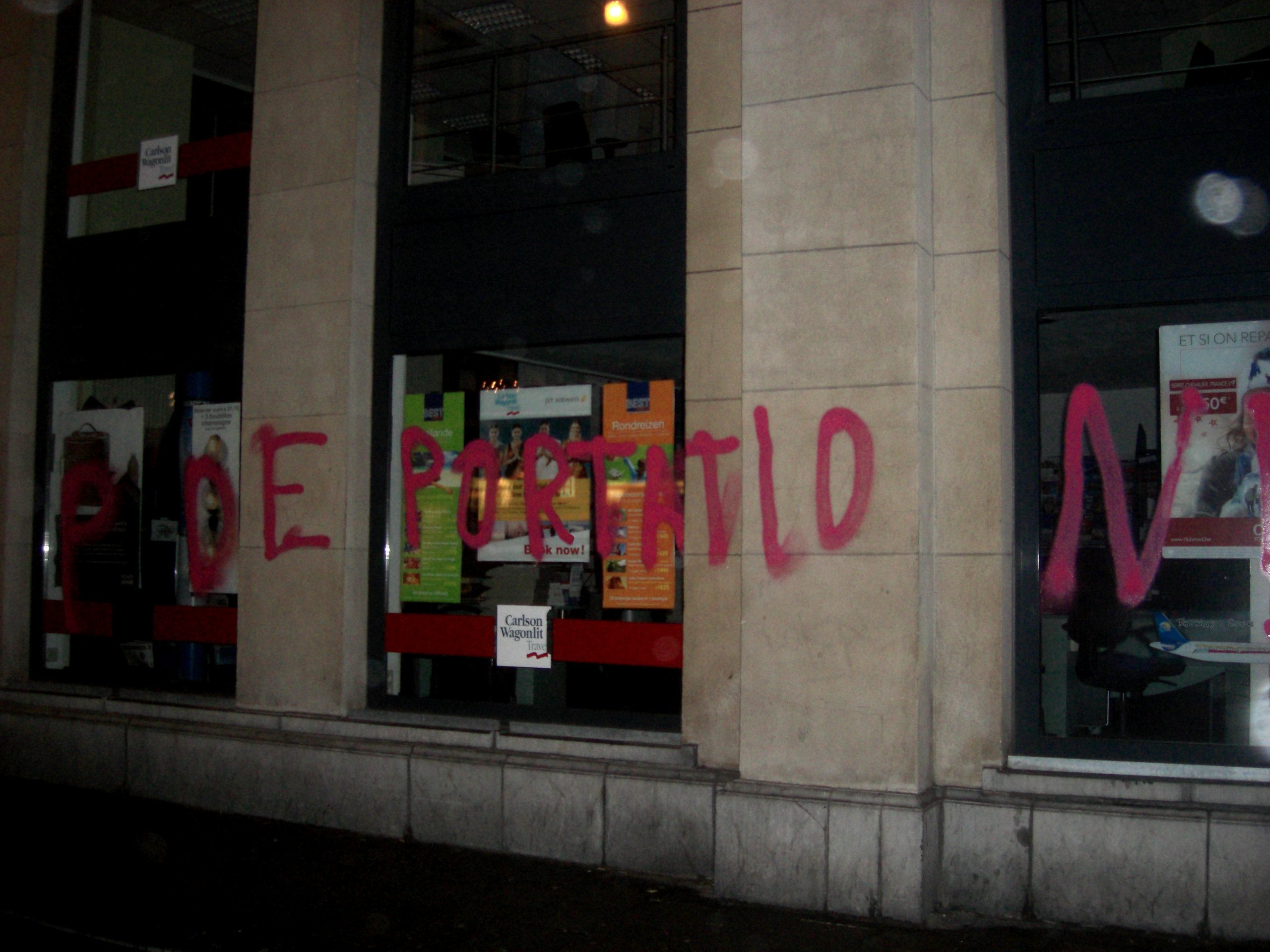Mardi tôt dans la matinée des inconnus ont saccagé les façades de différents entreprises activement impliquées dans le contrôle des flux migratoires. La façade de Carlson Wagonlit (gère le séjour des sans-papiers avant qu’ils soient expulsés) et de Randstad (livre les gardiens dans les centres fermés) ont par exemple été taguées.
