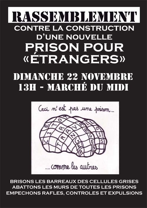 Depuis quelques mois, un nouveau centre fermé pour sans-papiers se construit à Steenokkerzeel et devrait être fini dans le courant de 2010. Bâti selon le modèle carcéral (avec cellules individuelles et moyens de contrôles avancés), il a pour but d’enfermer les plus récalcitrants et de servir de moyen de pression afin de mater les révoltes dans les autres centres fermés. De plus, directement situé dans le périmètre de l’aéroport, il facilitera les déportations, rendues plus rapides, discrètes et faciles à gérer. Rassemblement dimanche 22 novembre, 13h à la gare du midi.