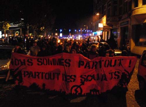 250 personnes environ se sont rassemblées entre 17h et 18h sur l’esplanade St-Léonard, encadrées par une dizaine de motards de la police locale loin et une demi-douzaine de policiers fédéraux de la section radicalisme qui cherchaient en vain un ‘responsable’ pour connaître le parcours de la manif qui a été tenu secret. Des activistes flamands et bruxellois étaient venus en nombre et constituaient probablement la moitié du cortège. C’est vers 18h que le cortège s’est mis en branle avec sono, flambeaux, pétards, slogans anti-capitalises, anarchistes et en faveur des migrants.