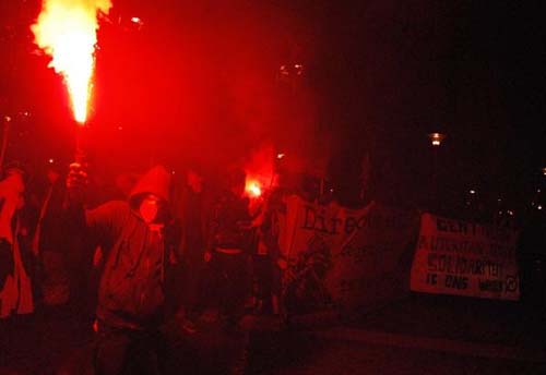 A la ‘chauve-souris’, une fête commence dehors et à l’intérieur. Non loin de là, deux activistes se font arrêter par la police. Ils sont accusés de tag. Des points de contrôle ont été installé par la police entre le Centre Social Occupé et la gare, plusieurs activistes se sont fait contrôler et fouiller en rentrant.