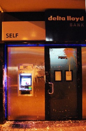 Place St-Lambert, le carrefour est bloqué symboliquement pendant une dizaine de minutes, le cortège repart et pénètre dans les galeries St-Lambert qui s’en sortent avec quelques tags à l’intérieur. Arrivé place République Francaise, la manif se dirige vers la rue Cathédrale, il doit être 18h45 au moment où le cortège pénètre dans la zone des magasins. Des vitrines sont tagguées, des banques sont molestées avec des bombes de peintures ainsi qu’un ou deux distributeurs de billets. Le carrefour St-Gilles-boulevard d’Avroy sera bloqué. Dans la rue St-Gilles, plusieurs banques, ainsi qu’un flic de la fédéral qui tente d’en protéger une, sont aspergées de peintures.
