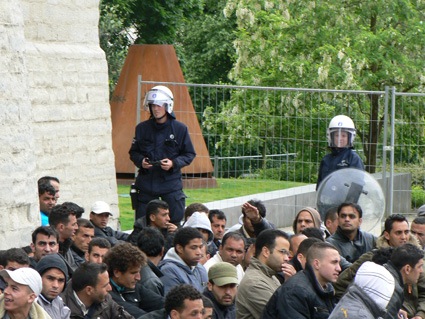 Pour info, il avait été décidé, comme pour d’autres actions, de faire en sorte de ne pas se faire arrêter (partir quand police le demande, etc). 15 d’entre eux ont été arrêtés administrativement (arrestation classique de maximum 12h, en général pour trouble à l’ordre public, pas de suites judiciaires) et ont donc juste passé la soirée au poste (à l’Amigo, commissariat de Bruxelles). Nous avons été genre une cinquantaine à nous rassembler devant pour demander leur libération. Les 6 autres (choisis de façon arbitraire) ont été arrêtés judiciairement pour ‘coups et blessures à agent’. Il s’agit d’A., C., D., L., R. et Y.. Selon ce que des policiers leur ont dit, l’un des leurs auraient eu une jambe cassée. Certains arrêtés ont cependant vu celui-ci grimper et descendre des escaliers dans le commissariat sans le moindre problème… Ci-dessous, le témoignage de l’un des arrêtés sur l’arrestation. Dans les 6, c’est apparemment principalement Y. qui est visé pour les coups et blessures. Quand on sait qu’il est aussi celui qui a déjà été arrêté judiciairement pour le même genre de faits il y a quelques mois au CGRA (déjà de façon arbitraire à l’époque)… Un policier est venu à un moment dans la cellule de C. (en croyant que c’était Y.) en disant qu’il avait cassé jambe d’un collègue etc. et il l’a frappé à la tête; quand il s’est rendu compte qu’il se trompait, il avait l’air un peu gêné (C. a par après porté plainte)… Quand Y. est revenu de l’interrogatoire, il avait l’air vraiment mal (vêtements déchirés…).