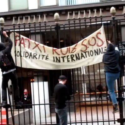 Début juin, une banderole avait été accrochée en solidarité avec Patxi Ruiz, prisonnier basque en grève de la faim (à laquelle il a mis fin le 10 juin). « Patxi Ruiz SOS, solidarité internationale ». Il y a quelques jours, l’ambassade d’Espagne a été taguée en solidarité avec Pablo Hasel, rappeur révolutionnaire menacé de prison. « Pablo Hasel Llibertat ».