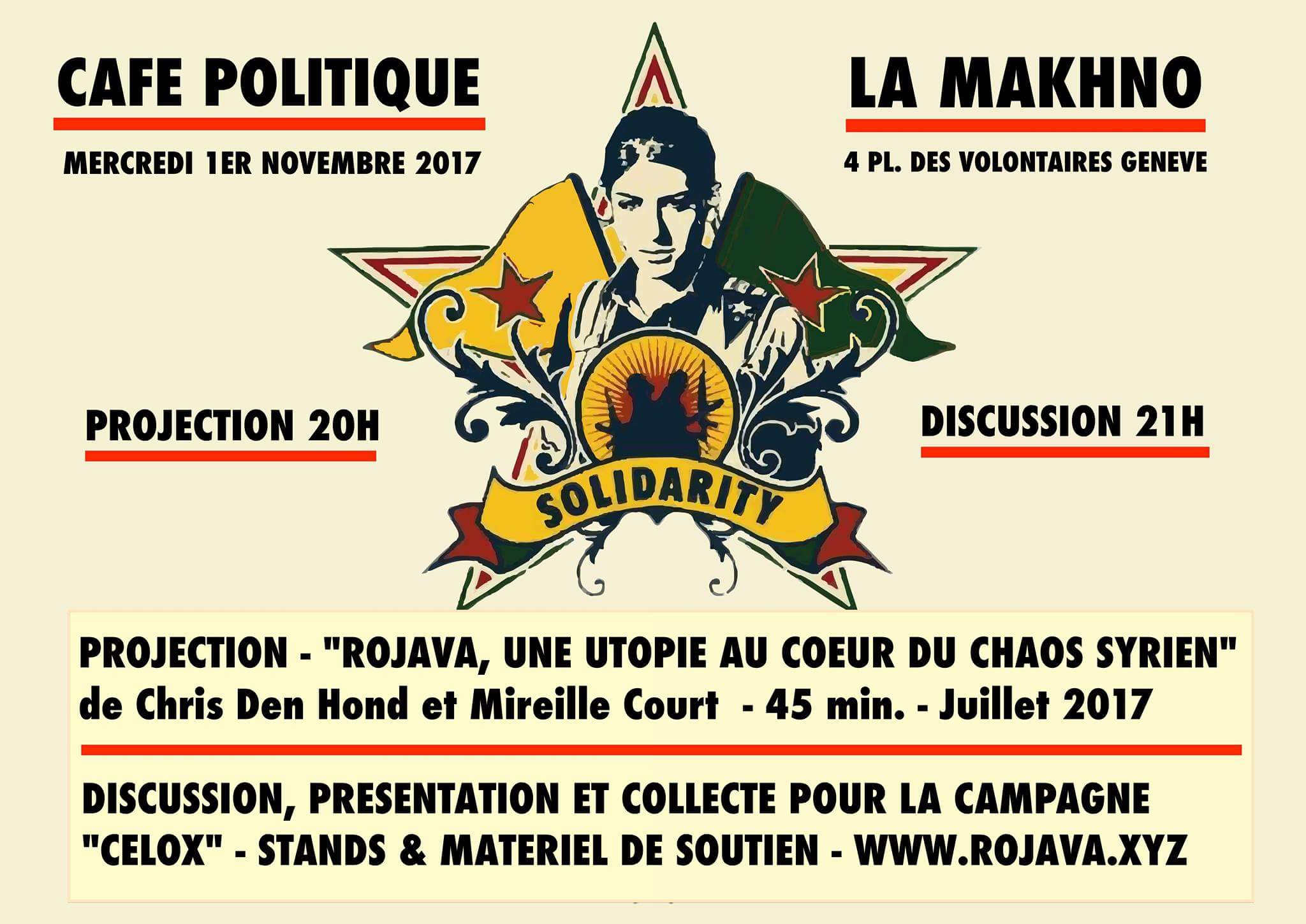 Dans le cadre de l’« International Kobane Day », La Makhno organise une soirée projection et discussion sur le Rojava. À 20h projection du documentaire « Rojava, une utopie au milieu du chaos syrie » réalisé en 2017 par Chris Den Hond et Mireille Court. Ce documentaire a l’intérêt de ne pas seulement aborder le sujet de la guerre contre Daesh. Il plonge également au cœur des changements qui ont lieu dans la société civile du nord de la Syrie. La projection sera suivie d’une discussion/débat sur le projet révolutionnaire au Rojava et une présentation de la campagne « CELOX ». Afin de soutenir cette campagne une table de presse ainsi qu’une récolte de fonds seront organisés.