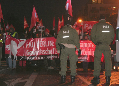C’est pour protester contre cette interdiction et toutes ses conséquences que plus de 300 personnes se sont rassemblées ce samedi à Berlin, encadrée par une horde de policiers. Les slogans lancés visaient non seulement la décision du tribunal, mais aussi le rôle joué par le gouvernement local et le syndicat réformiste Ver.di, qui ont soutenu la direction du cinéma dans son action contre la FAU.